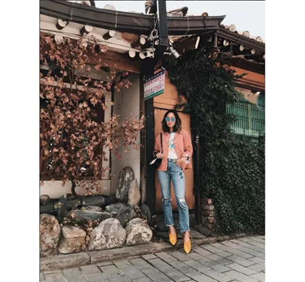 Η Aimee Song φοράει το απόλυτο τζιν της σεζόν: Cropped ή με ρεβέρ, σκισίματα στα γόνατα και ανοιχτό γαλάζιο χρώμα.
