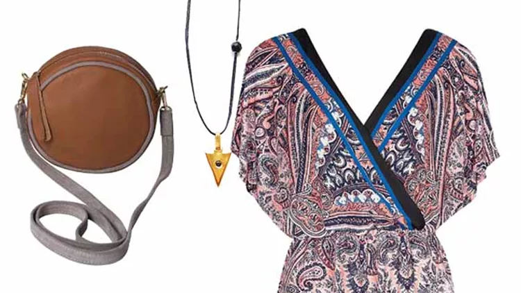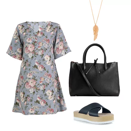 Φόρεμα, e-xclusive, 30,00 ευρώ (από 59), www.e-xclusive.comΦλατ σανδάλια, Bozikis, 29,99 ευρώ (από 39,99), www.bozikis.grShopper τσάντα, Η&Μ, 29,99 ευρώ, www.hm.comΚολιέ Pink Collection, Li-LA-LO, 60,00 ευρώ, www.lilalo.com