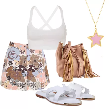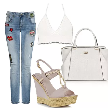Τζιν με σκισίματα και patches Celestino, 24,00 ευρώ, celestino.grCrop top κεντητό Pink Woman, 9,99 ευρώ, pinkwoman-fashion.comΠλατφόρμες πέδιλα Bozikis, 34,99 ευρώ, bozikis.grΤσάντα χειρός Axel, 35,50 ευρώ, axelaccessories.com