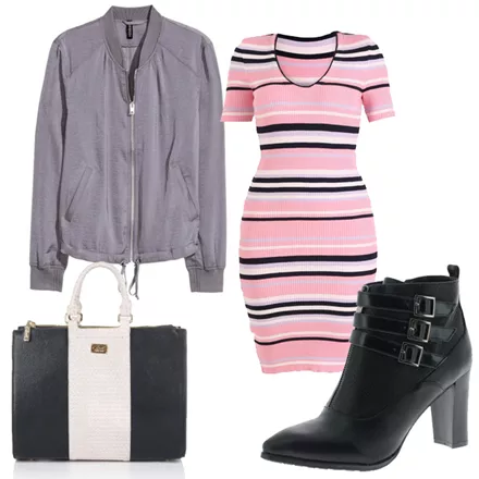 Rib knit φόρεμα e-xclusive, 39,00 ευρώ, e-xclusive.grBomber jacket σε γκρι-μοβ απόχρωση H&M, 29,99 ευρώ, hm.com/grΜποτάκια με αγκράφες IQ Shoes, 32,90 ευρώ, iqshoes.grΤσάντα χειρός Axel, 77,00 ευρώ, axelaccessories.com