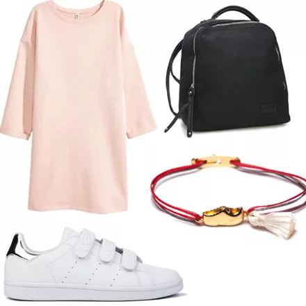 Φούτερ – φόρεμα H&M, 19,99 ευρώ, hm.comΣακίδιο πλάτης, Helmi, 33,90 ευρώ, helmi.grΛευκά αθλητικά Migato, 45,00 ευρώ, migato.comΜάρτης με χρυσό τσαρούχι, Jam Jar, 9,00 ευρώ, jamjar.gr
