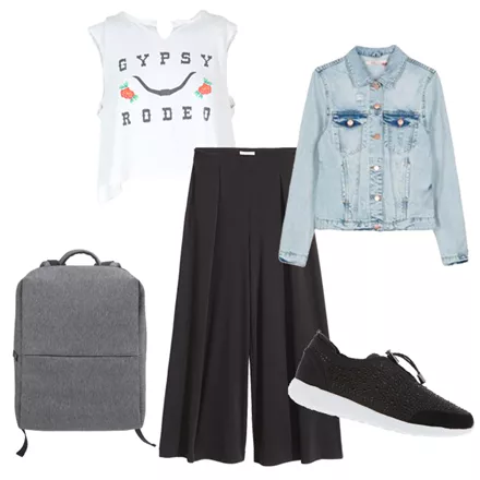 Tank top Minkpink, Favela, 59.00 ευρώ, www.favela.grKοντό τζιν μπουφάν, BSB, 79.90 ευρώ, www.bsbfashion.comCulottes, H&M, 39.99 ευρώ, www.hm.comSneaker με σουέντ λεπτομέρειες, KeepFred, 59.00 ευρώ, www.keepfred.grLaptop Backpack Côte & Ciel, Designisthis, 169.00 ευρώ, www.designisthis.com