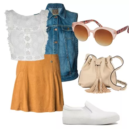 Φούστα New Indie, Attrattivo, 49.90 ευρώ, store.attrattivo.grSlip ons, Migato, 40 ευρώ, www.migato.comΓυαλιά ηλίου, Pink Woman, 7. 99 ευρώ, pinkwoman-fashion.comTop, MinkPink – Wild Traveller, 79 ευρώ, favela.grΤσάντα, Axel Accessories, www.axelaccessories.comTζιν γιλέκο, 69.90 ευρώ, store.attrattivo.gr