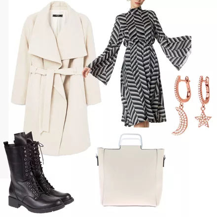 Αρβύλες ψηλές Shoemart, 28,00 ευρώ, shoemart.grΤσάντα IQshoes, 16,40 ευρώ, iqshoes.grMidi φόρεμα Regalinas, 49,90 ευρώ, regalinas.grΜάλλινο παλτό Mango, 129,99 ευρώ, mango.comΚοντά σκουλαρίκια FolliFollie, 60,00 ευρώ, follifollie.com
