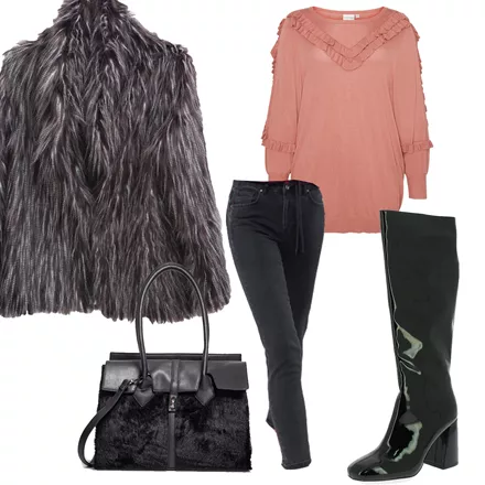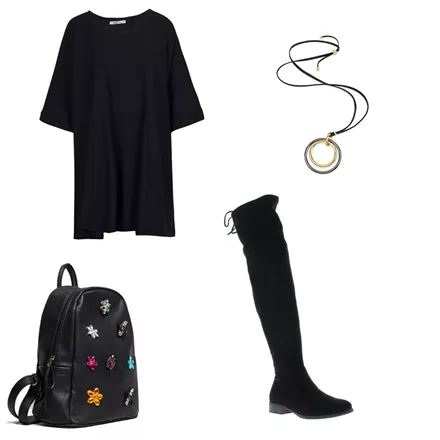 Oversized φόρεμα, BSB, 59,90 €, www.bsbfashion.comΓυναικείες μπότες, IqShoes, 52,90 €, www.iqshoes.grΜαύρο σακίδιο με κεντητές πέτρες, Migato, 57,00 €, www.migato.comΜακρύ δερμάτινο κολιέ, Folli Follie, 80,00 €, www.follifollie.com