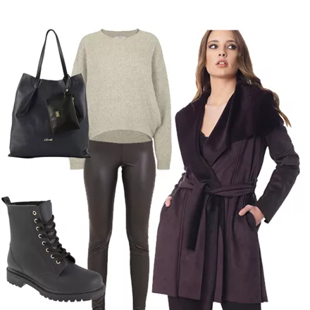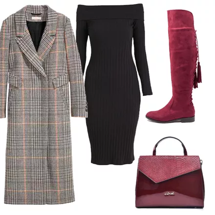 Φόρεμα με ύφανση rib e-xclusive, 49 ευρώ, e-xclusive.comΠαλτό με καρό μοτίβο H&M, 129 ευρώ, hm.comΣουέντ μπότες MIGATO, 65 ευρώ, migato.comΤσάντα λουστρίνι και κροκό Axel, 75 ευρώ, axelaccessories.com