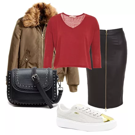Μπλούζα, Pink Woman, 9.99 ευρώ, pinkwoman-fashion.comCreepers Puma Suede Creeper Gold, 110 ευρώ, favela.grPencil φούστα, 49 ευρώ, www.e-xclusive.comΤσαντάκι, Migato, 47 ευρώ, www.migato.comBomber jacket, Η&Μ, 39.99 ευρώ, www.hm.com