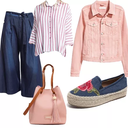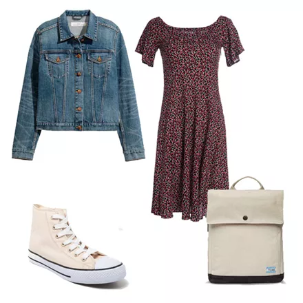 Denim jacket, H&M, 34,99 ευρώ, hm.comΦόρεμα, HELMI, 49,90 ευρώ, helmi.grSneakers, Migato, από 20,00 τώρα 5,00 ευρώ, migato.comΤσάντα, TOMS, 80,00 ευρώ, sagiakos.gr