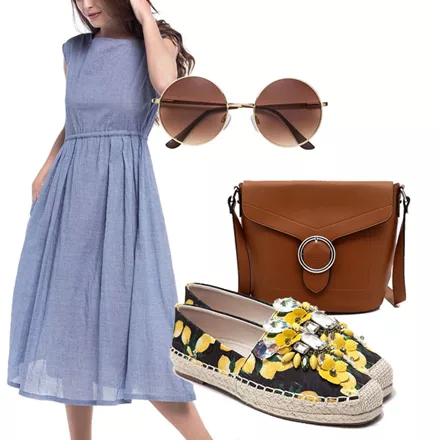 Φόρεμα, HELMI, 69.90 ευρώ, www.helmi.grΕσπαντρίγιες, Hetty Yellow, 49 ευρώ, www.keepfred.grΤσάντα, Bozikis, 24.99 ευρώ, www.bozikis.grΓυαλιά ηλίου, Η&Μ, 7.99 ευρώ, www2.hm.com