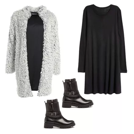 Γούνινο παλτό, Helmi, 79,90 ευρώ, www.helmi.grΦόρεμα, H&M, 14,99 ευρώ, www.hm.comΜποτάκια, Μigato, 55,00 ευρώ, www.migato.com