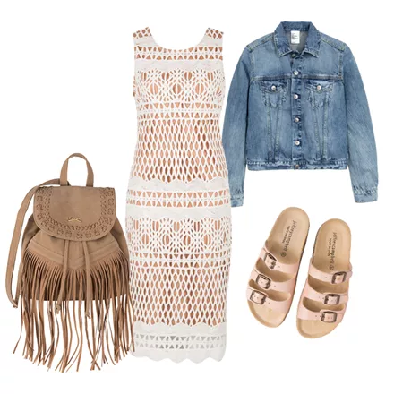 Crochet αμάνικο φόρεμα, BSB, 89.90 ευρώ, www.bsbfashion.comDenim jacket, H&M, 29.99 ευρώ, www.hm.comNude flatforms Jeffrey Campbell, StyleBubbles, 79.00 ευρώ, stylebubbles.comBackpack, Achilleas Accessories, από 39.90 ευρώ τώρα 35.91 ευρώ, www.achilleasaccessories.gr