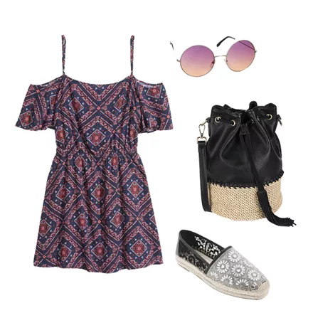 Φόρεμα, H&M, 14,99 ευρώ, www.hm.comΤσάντα πουγκί, Achilleas Accessories, 48,51 ευρώ, www.achilleasaccessories.grEspadrilles, Keep Fred, 49,00 ευρώ, www.keepfred.grΓυαλιά ηλίου, Pink Woman, 9,99 ευρώ, www.pinkwoman-fashion.com