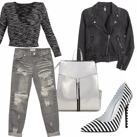 Τζιν παντελόνι One Teaspoon, 158,00 ευρώ, stylebubbles.comΚρουαζέ τοπ e-xclusive, 19,00 ευρώ, e-xclusive.grΤζιν μπουφάν σε στυλ biker Η&Μ, 49,99 ευρώ, hm.com/grΓόβες Jeffrey Campbell, 93,00 ευρώ, favela.grBackpack μεταλλιζέ Pink Woman, 35,99 ευρώ, pinkwoman-fashion.com