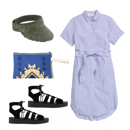 Shirt dress, H&M, 29,99 ευρώ, www.hm.comClutch, Endless Blue Collection by Valerie Moser, 50,00 ευρώ,www.stylebubbles.comΣανδάλια, Fred, 65,00 ευρώ, www.keepfred.grΨάθινο καπέλο, Seeberger, 36,00 ευρώ, www.stylebubbles.com
