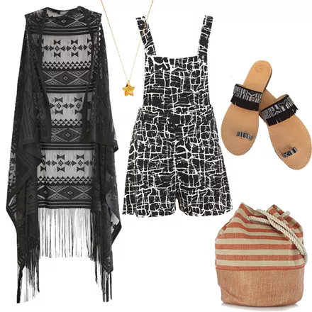 Jumpsuit με τύπωμα, e-xclusive, 45.00 ευρώ, www.e-xclusive.comΔαντελένιο καφτάνι – παρεό με κρόσσια, e-xclusive, 25.00 ευρώ, www.e-xclusive.comΔερμάτινα χειροποίητα σανδάλια Black panther, Jam Jar, 39.00 ευρώ,www.jamjar.grTσάντα θαλάσσης πουγκί, Bozikis, 19.99 ευρώ, www.bozikis.grΚολιέ Teens Collection, Li La Lo, 60.00 ευρώ, www.lilalo.com