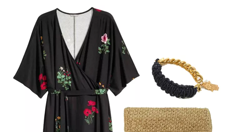 Wrap dress με λουλούδια, 34.99 ευρώ, www.hm.comΜαύρα σανδάλια, 75.00 ευρώ, www.keepfred.grΜακραμέ βραχιόλι, από 14.00 ευρώ τώρα 9.00, www.e-xclusive.comCrochet clutch Seeberger, 31.50 ευρώ, www.stylebubbles.com