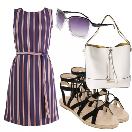 Ριγέ φόρεμα, 49 ευρώ, www.e-xclusive.comΓυαλιά ηλίου, Μigato, 35 ευρώ, www.migato.comΤσάντα, Achilleas Accessories, 29.52 ευρώ, achilleasaccessories.grΠαπούτσια Ava Black, 55 ευρώ, www.keepfred.gr