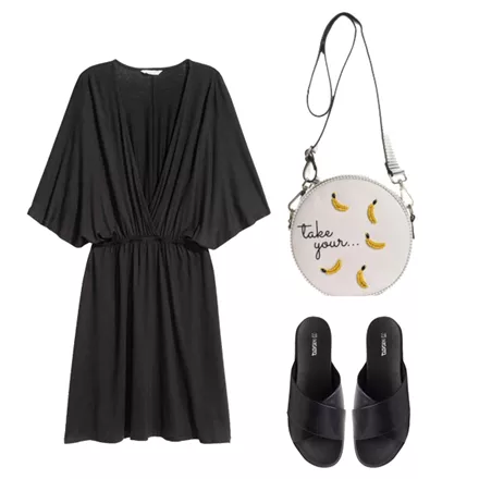 Φόρεμα, H&M, 14,99 ευρώ, www.hm.comΤσάντα ώμου με κεντητές μπανάνες, 73,00 ευρώ, AxelAccessories, www.axelaccessories.grΣανδάλια, Migato, 20,00 ευρώ, www.migato.com