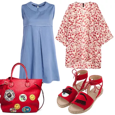 Φόρεμα mini denim Helmi, 59,90 ευρώ, helmi.grΚιμονό φλοράλ H&M, 14,99 ευρώ, h&m.comΠαπούτσια Keep Fred, 59,00 ευρώ, keepfred.grΤσάντα MIGATO, 46,00 ευρώ, migato.com