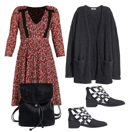 Φόρεμα, e-xclusive, 69,00 ευρώ, www.e-xclusive.comΖακέτα, H&M, 59,99 ευρώ, www.hm.comMαύρο σακίδιο, Μigato, 50,00 ευρώ, www.migato.comCut out μποτάκια, Ε8 by Miista, 119,00 ευρώ, www.favela.gr
