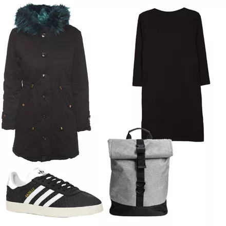 Φόρεμα με τσέπες, BSB, 59.90 ευρώ, www.bsbfashion.comΑθλητικά, Adidas Original Gazelle, 129.95 ευρώ, www.favela.grΠαρκά με συνθετική γούνα, Pink Woman, 79.99 ευρώ, www.pinkwoman-fashion.comBackpack, H&M, 34.99 ευρώ, www.hm.com