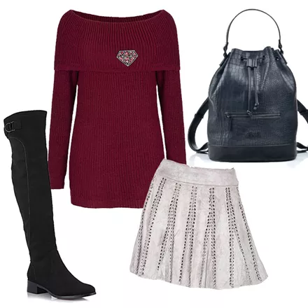 Έξωμο πουλόβερ με patch Celestino, 19,95 ευρώ, celestino.grΜίνι φούστα με κορδόνια Glamorous, 128,00 ευρώ, favela.grΜπότες σουέντ Bozikis, 39,99 ευρώ, bozikis.grΣακίδιο πλάτης και ώμου Axel, 60,80 ευρώ, axelaccessories.gr