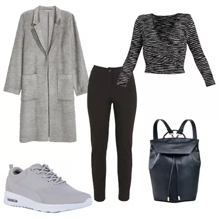 Παλτό, H&M, 49,99 ευρώ, hm.comΤοπ, e-xclusive, από 32,00 τώρα 10,00 ευρώ, e-xclusive.comΠαντελόνι, e-xclusive, 39,00 ευρώ, e-xclusive.comΣακίδιο, Axel, 63,00 ευρώ, axelaccessories.comSneakers, Bozikis, 19,99 ευρώ, bozikis.gr