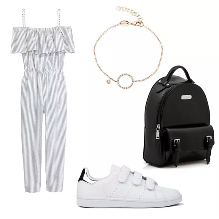 Ολόσωμη φόρμα, H&M, 39,99 ευρώ, www.hm.comΛευκό αθλητικό, Migato, 35,00 ευρώ, www.migato.comΒραχιόλι Diamonds Collection, Li La Lo, 620,00 ευρώ, www.lilalo.comΤσάντα πλάτης, Bozikis, 29,99 ευρώ, www.bozikis.gr