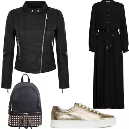 Μάξι φόρεμα με κουμπιά BSB, 89,90 ευρώ, bsbfashion.comBiker jacket Celestino, 27,95 ευρώ, celestino.grΧρυσά sneakers H&M, 24,99 ευρώ, hm.comΓυναικείο σακίδιο Gessy – Kybeli, 42,00 ευρώ, favela.gr