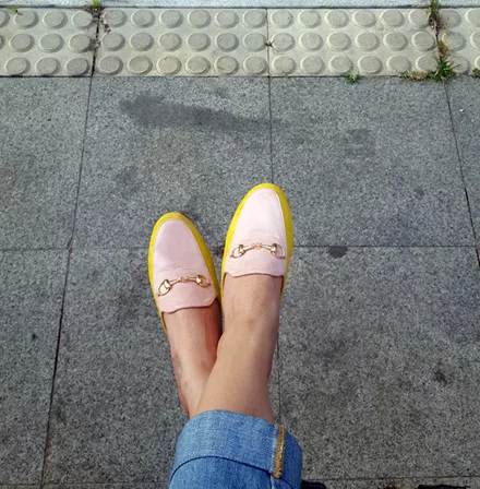 Business casual: Απογείωσε το κλασικό ριγέ πουκάμισο και το τζιν με ένα από τα πιο hot παπούτσια της σεζόν: το φλατ mule.