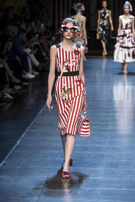 Oι κάθετες ρίγες θα μακρύνουν τη φιγούρα σου, αλλά γιατί να σταματήσεις στα πουκάμισα και τα φορέματα; Τα παντελόνια και τα γιλέκα με το εν λόγω print μπορούν να δώσουν άλλη πνοή σε μία απλή εμφάνιση. Τόλμησε να συνδυάσεις τις ρίγες με πουά! (Dolce & Gabbana)
