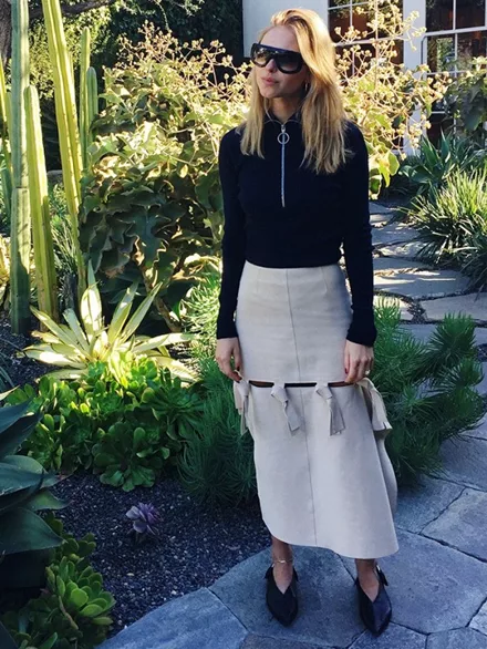 Τα V-neck flats είναι ένας έξυπνος τρόπος να κάνεις ακόμα πιο κολακευτική τη midi φούστα. Φωτογραφία: Look De Pernille
