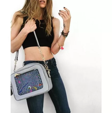 Οι denim λεπτομέρειες στην συγκεκριμένη τσάντα πόλης δίνουν χαρακτήρα ακόμα και στο λιτό look της Αθηνάς Οικονομάκου