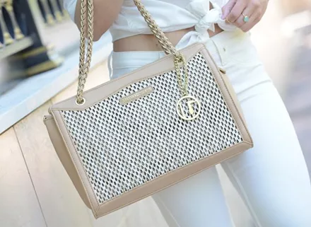 Μια σταθερή τσάντα με χρυσή αλυσίδα και πλεκτή λεπτομέρεια είναι ο,τι πιο ευκολοφόρετο για κάθε πρωινή εμφάνιση.