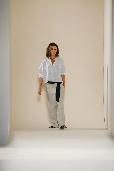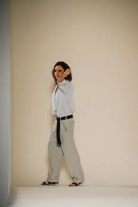 Η ίδια, μάλιστα, δήλωσε για τη συλλογή της: «Nιώθω πως τώρα είναι η εποχή μου. Έτσι θέλω να ντύνομαι τώρα. Το στυλ είναι πιο χαλαρό, πιο άνετο και πιο ατημέλητο. Ήθελα τα ρούχα να μοιάζουν σα να φορέθηκαν στα γρήγορα». Πιστό σε αυτό το ύφος ήταν και το outfit της, το οποίο είδαμε να φοράει στο φινάλε του show: χαλαρό πουκάμισο με ρίγες, φαρδύ χαμηλοκάβαλο παντελόνι, ζώνη και φλατ σανδάλια.