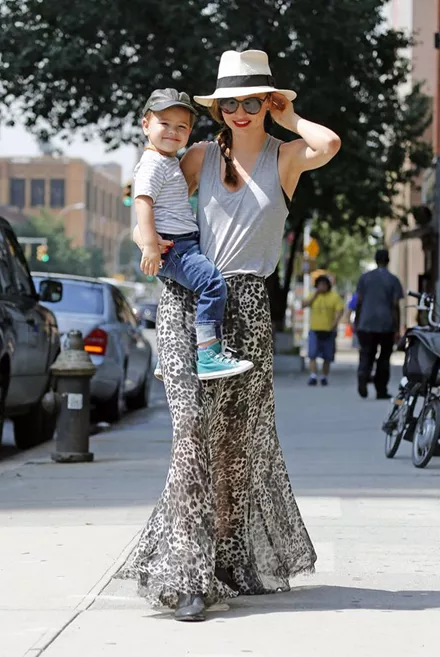 Η Miranda Kerr επιλέγει μάξι ημιδιάφανη φούστα σε animal print και τη συνδυάζει με αθλητικό γκρι τοπ και μποτάκια.