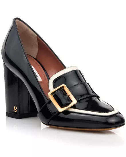 Για όσες είναι για πάντα ταγμένες στο τακούνι – η Janelle έρχεται τώρα και με τετράγωνο τακούνι 3cm (με babouche) και 8,5cm σε μαύρο συνδυασμένο με μπεζ (bone το αποκαλεί η Bally) ενώ και τα δύο σχέδια συνοδεύονται από το “B” του brand λοξά τοποθετημένο στο τετράγωνο τακούνι.