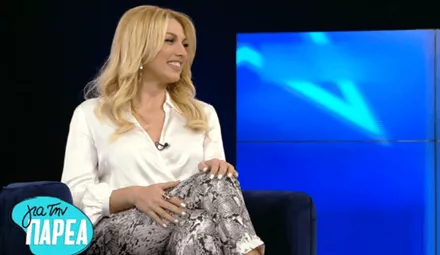 Πιο συγκεκριμένα, η Bίκυ Χατζηβασιλείου το επέλεξε σε μία total εμφάνιση με skinny snake skin παντελόνι και matchying top με έξω τους ώμους.