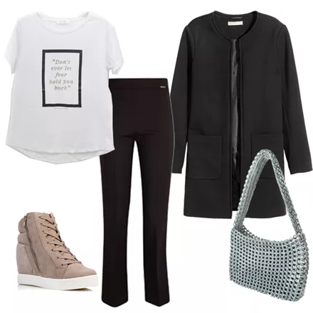Λευκό T-shirt με στάμπα, 14.90 ευρώ, www.macadamiafashionΠαντελόνι με τσάκιση σε ίσια γραμμή, BSB, 59.50 ευρώ, www.bsbfashion.comΓυναικεία παπούτσια Steve Madden, NAK, από 79.50 ευρώ τώρα 59.00 ευρώ, www.nak.grΧειροποίητη Μεταλλική Τσάντα Socorro - Escama Studio, 120.00 ευρώ, www.designisthis.comStraight-cut jacket, 39.99 ευρώ, www.hm.com
