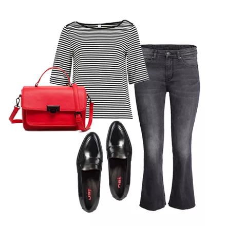 Ριγέ μπλούζα, e-xclusive, 39,00 ευρώ, www.e-xclusive.comCropped παντελόνι καμπάνα, H&M, 29,99 ευρώ, www.hm.com/grTσάντα ώμου, Migato, 62,00 ευρώ, www.migato.comLoafers, Nak, 64,50 ευρώ, www.nak.gr