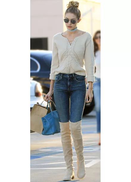 Η Gigi Hadid φοράει κρεμ πουλόβερ και μπότες στο ίδιο χρώμα μαζί με το τζιν της για μία αναβαθμισμένη casual εμφάνιση.