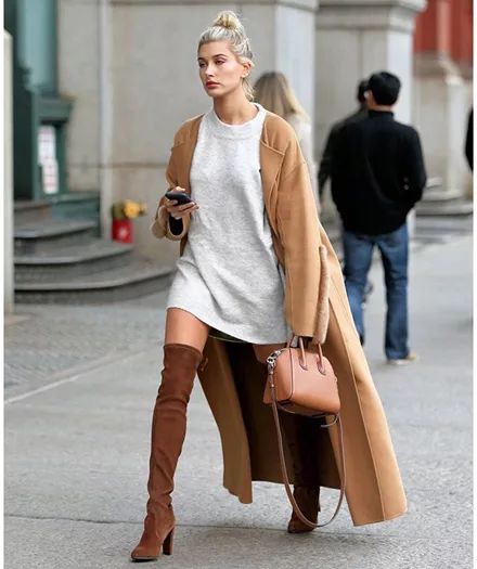 Η Hailey Baldwin κρατάει ισορροπίες φορώντας ένα φαρδύ πουλόβερ και ένα μάξι παλτό πάνω από τις σέξι over the knee μπότες της.