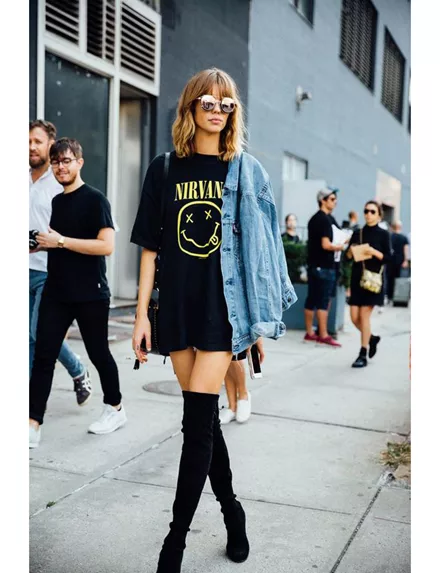 Φόρεσε τις over the knee μπότες με ένα φαρδύ T-shirt/ φόρεμα και το denim μπουφάν σου