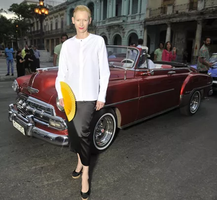 Η Tilda Swinton υπέρκομψη όπως πάντα μπροστά από το προσωπικό της ταξί.