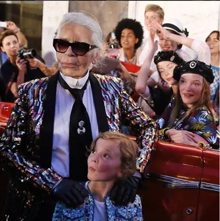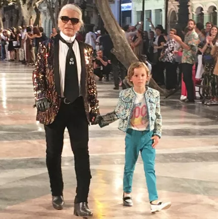Ο Karl Lagerfeld έκλεισε το show περπατώντας στο catwalk μαζί με το βαφτιστήρι του (όπως πάντα) και φορώντας σακάκι του οίκου Saint Laurent!