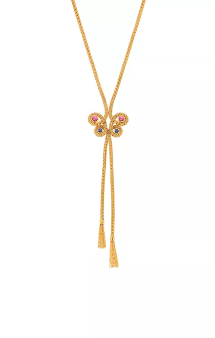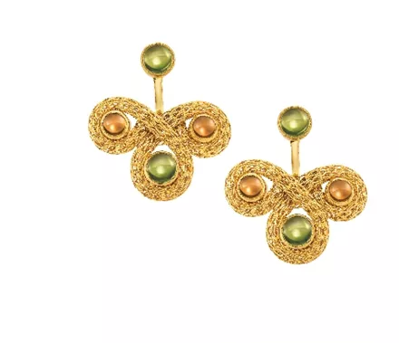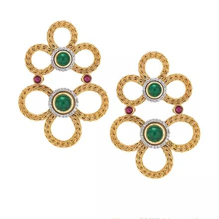 Οι χρυσές κλωστές 18 καρατίων υφαίνουν και συνθέτουν κορδόνια, κρόσσια και γαρνιτούρες, καθώς το λεπτό κέντημα του κοσμήματος στολίζεται με πολύτιμους λίθους σε χρώματα απαλά (το μελί του κιτρίνη, το ροζ της τουρμαλίνης, το πράσινο του περίδοτου, το μωβ του ιολίτη) ή λαμπερά (το πορφυρό του ρουμπινιού, το βαθύ πράσινο του σμαραγδιού, το καθάριο του διαμαντιού).