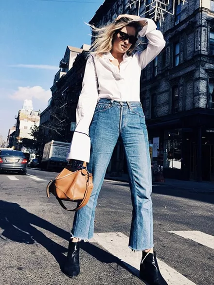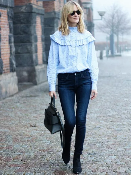 Denim παντελόνι + ρομαντικό πουκάμισο. Φωτογραφία: Blame It On Fashion