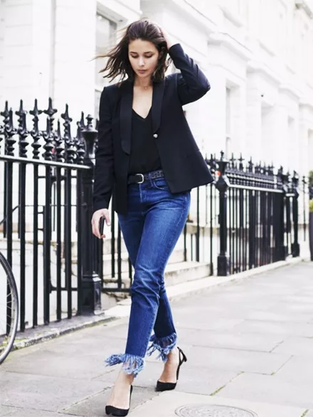 Denim παντελόνι με κρόσια στο τελείωμα + μαύρο top + σακάκι. Φωτογραφία: Harper & HarleyΔιάβασε επίσης: Alexa Chung: Ποιο είδος denim δεν θα φορούσε ποτέ και γιατί;