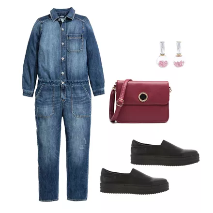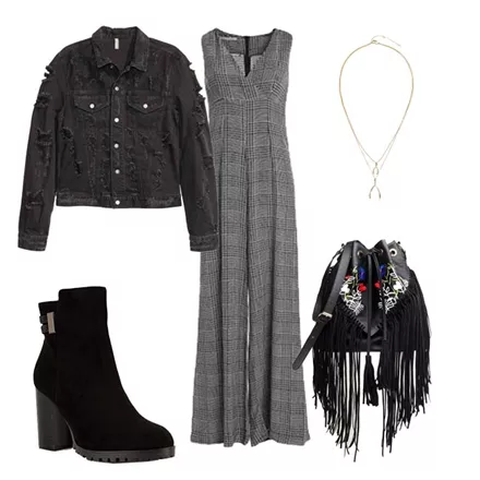 Ολόσωμη φόρμα, Anna Prelevic by Helmi, 89,90 ευρώ, helmi.grΜποτάκια, Bozikis, 29,99 ευρώ, bozikis.grDenim Jacket, H&M, από 49,99 τώρα 29,99 ευρώ, hm.comΤσάντα, Migato, 59,00 ευρώ, migato.comΚολιέ, H&M, 5,99 ευρώ, hm.com