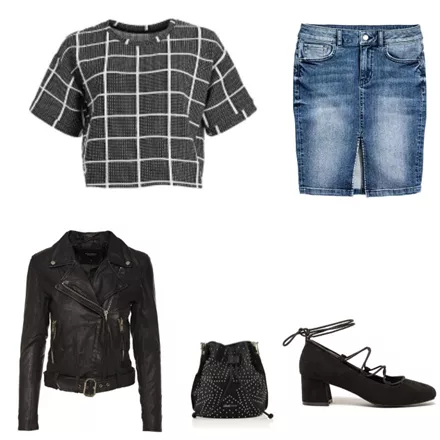 Φούστα denim, H&M, 29.99 ευρώ, www.hm.comΚοντομάνικο boxy τοπ, e-xclusive, 35.00 ευρώ, www.e-xclusive.comΜαύρη lace up γόβα, Migato, 55.00 ευρώ, www.migato.comΔερμάτινο jacket, Pink Woman, 119.99 ευρώ, www.pinkwoman-fashion.comΤσάντα πουγκί με τρουκς, Axel Concept, 71.00 ευρώ, www.axelaccessories.com